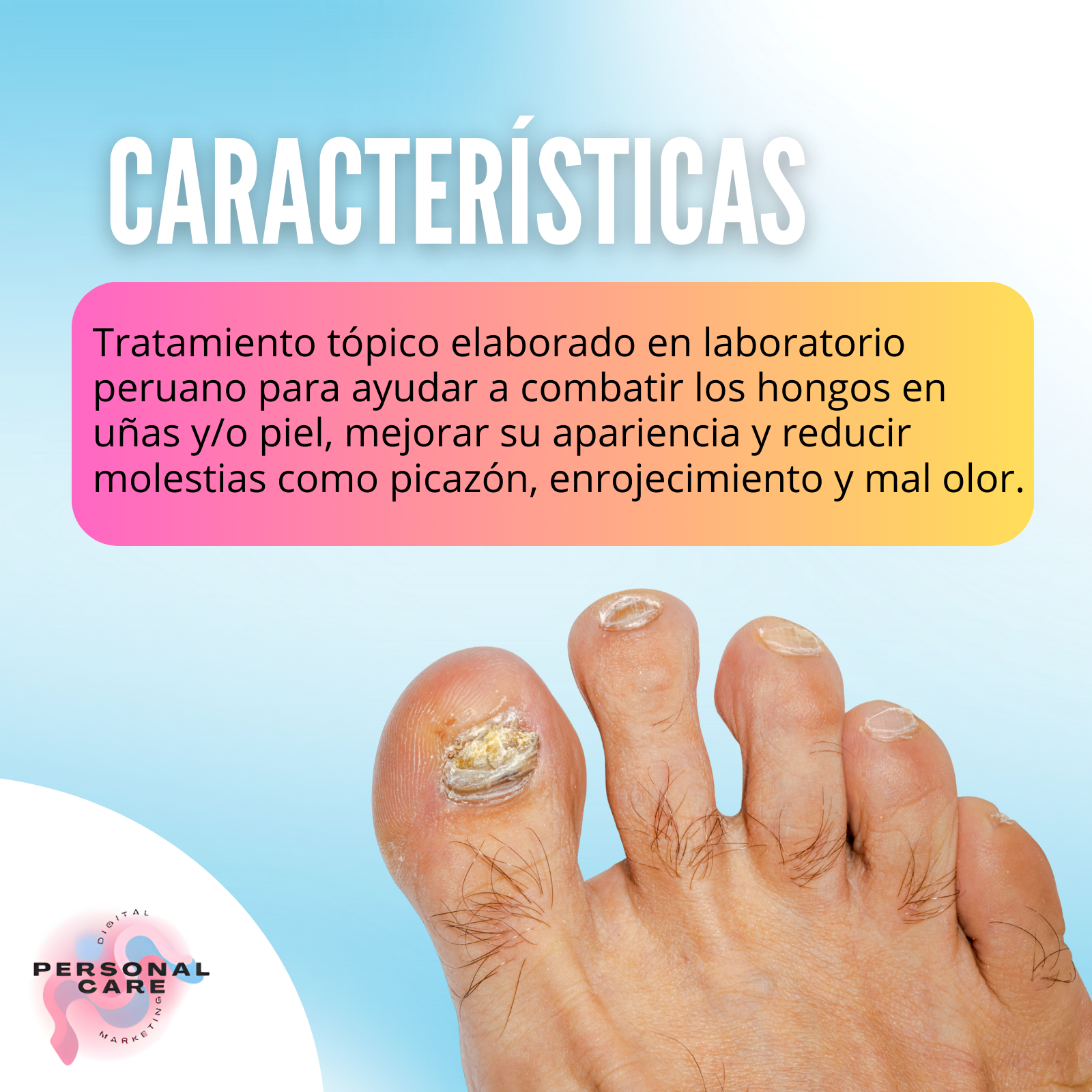 Tratamiento tópico elaborado en laboratorio peruano para ayudar a combatir los hongos en uñas y/o piel, mejorar su apariencia y reducir molestias como picazón, enrojecimiento y mal olor. Su fórmula está diseñada para limpiar, desinfectar y proteger la zona afectada, favoreciendo unas uñas y piel de aspecto más sano con el uso constante. Ideal para quienes buscan una opción práctica de uso diario como apoyo en casos de hongos persistentes en pies o manos.