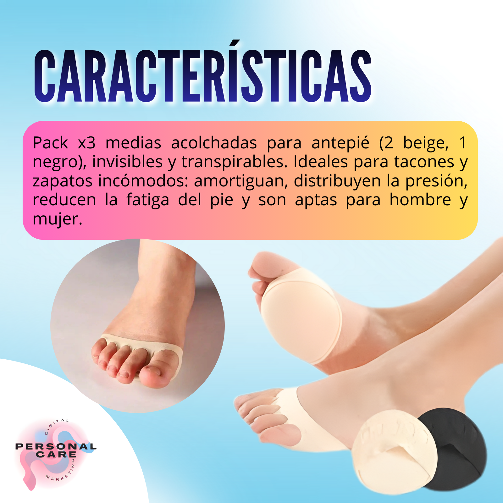 Medias acolchadas tipo calcetín invisible, ideales para usar con tacones y zapatos incómodos. Están diseñadas para proteger el antepié, dedos y arco, ofreciendo una agradable amortiguación y mejor distribución de la presión al caminar o estar de pie por varias horas.