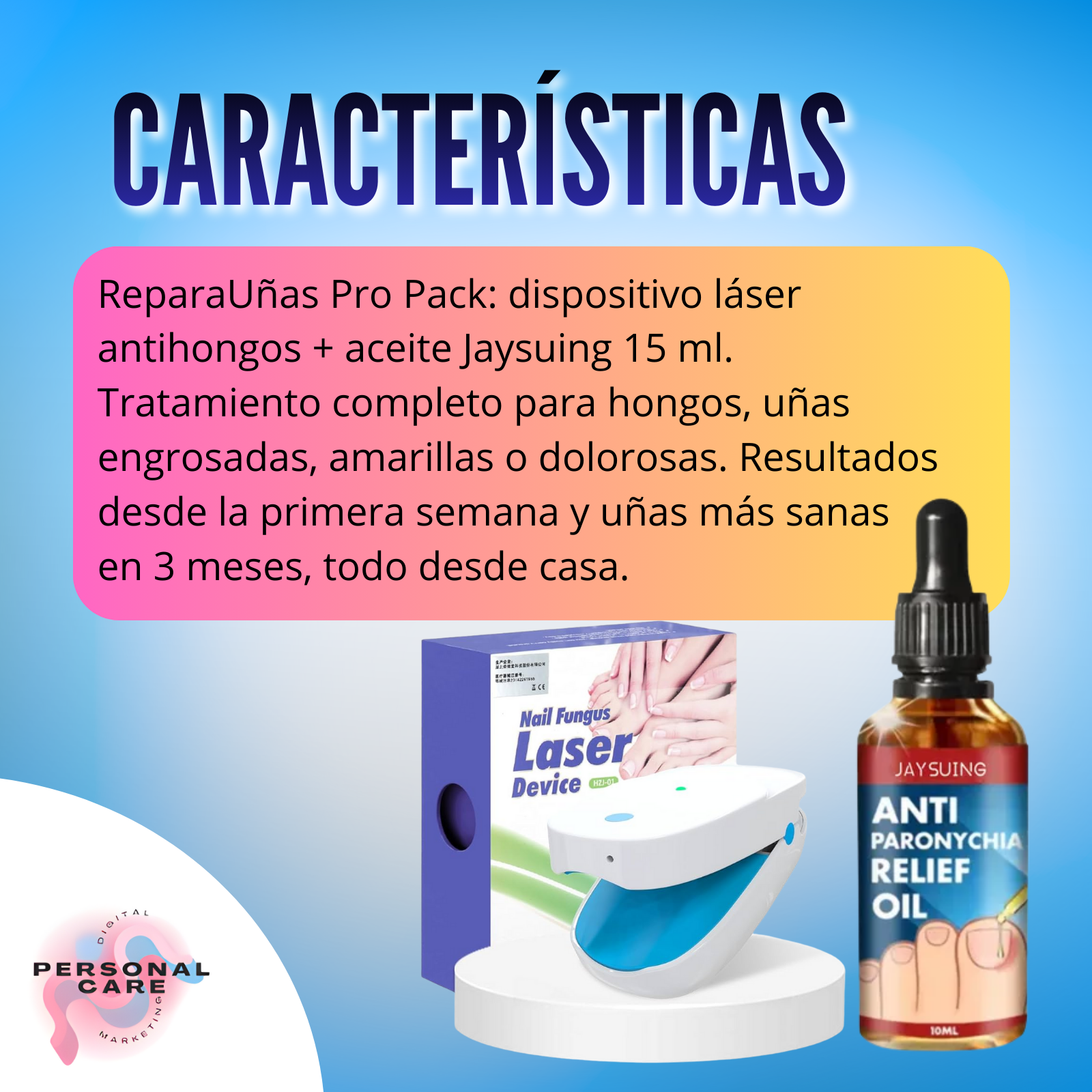 El ReparaUñas Pro Pack combina la tecnología de láser terapéutico con el Aceite Anti Paroniquia Jaysuing para un tratamiento completo contra hongos, uñas engrosadas, decoloración, mal olor y molestias. Ideal para usar cómodamente desde casa.